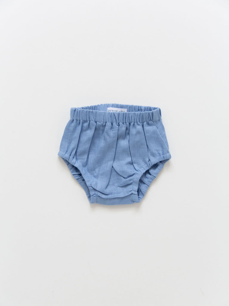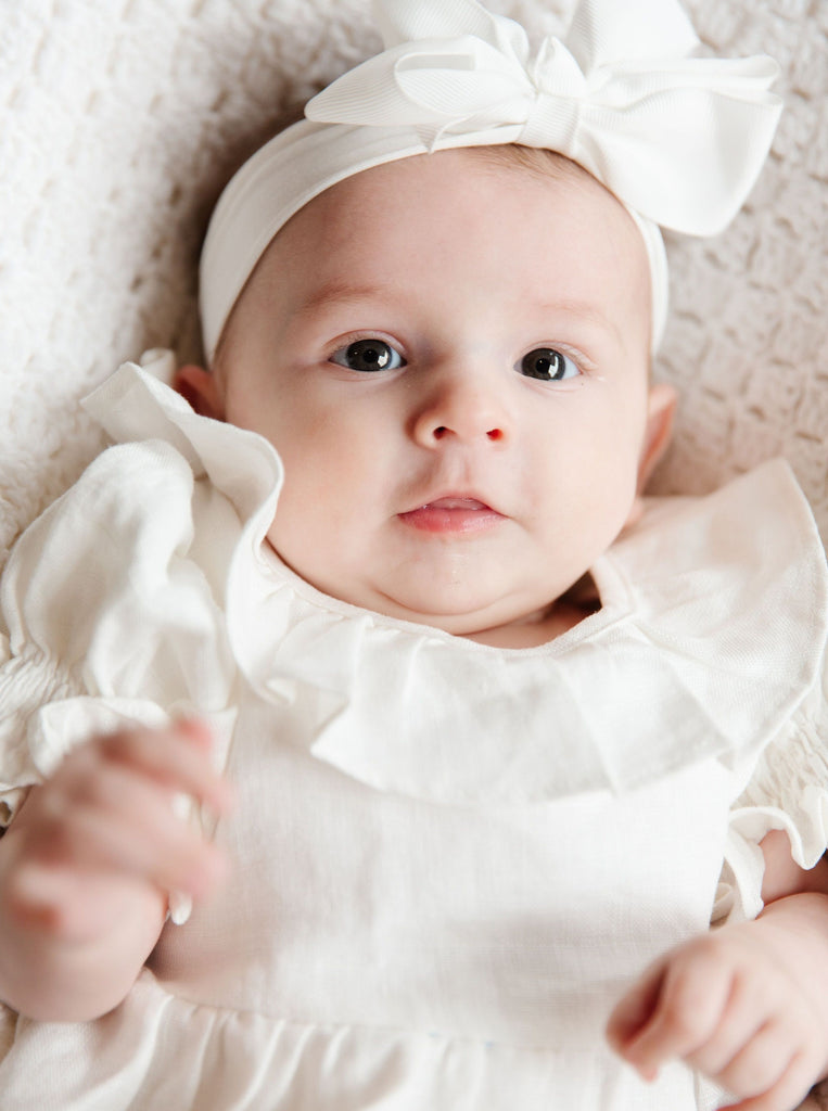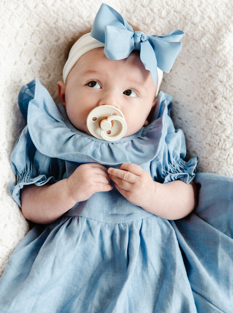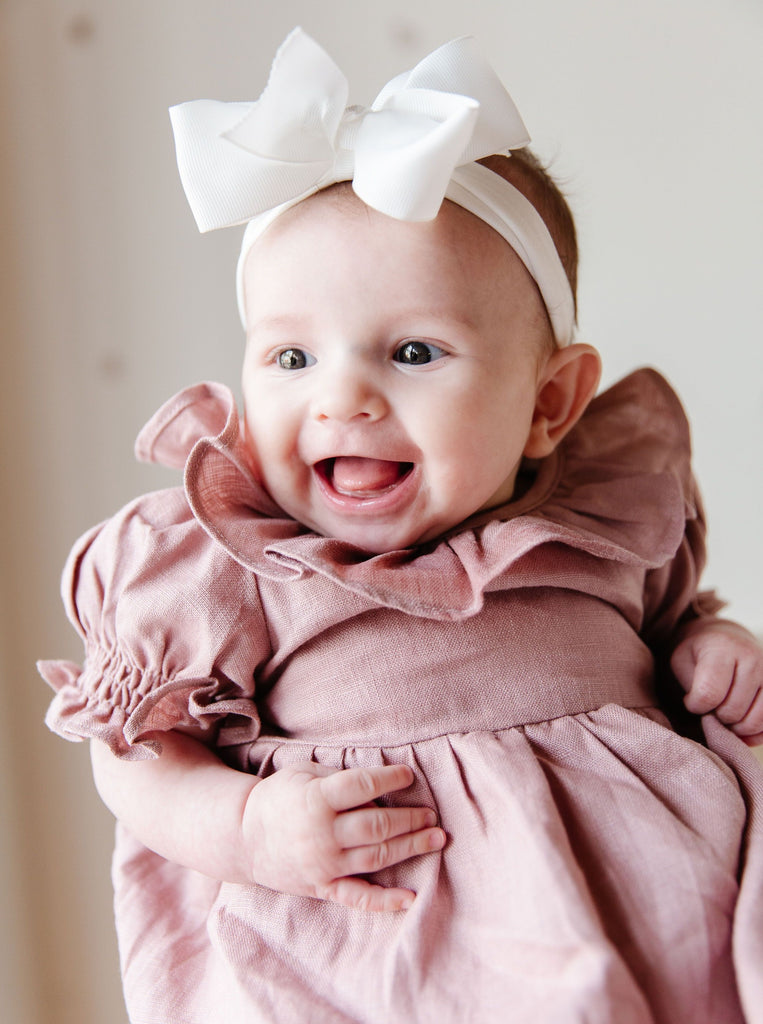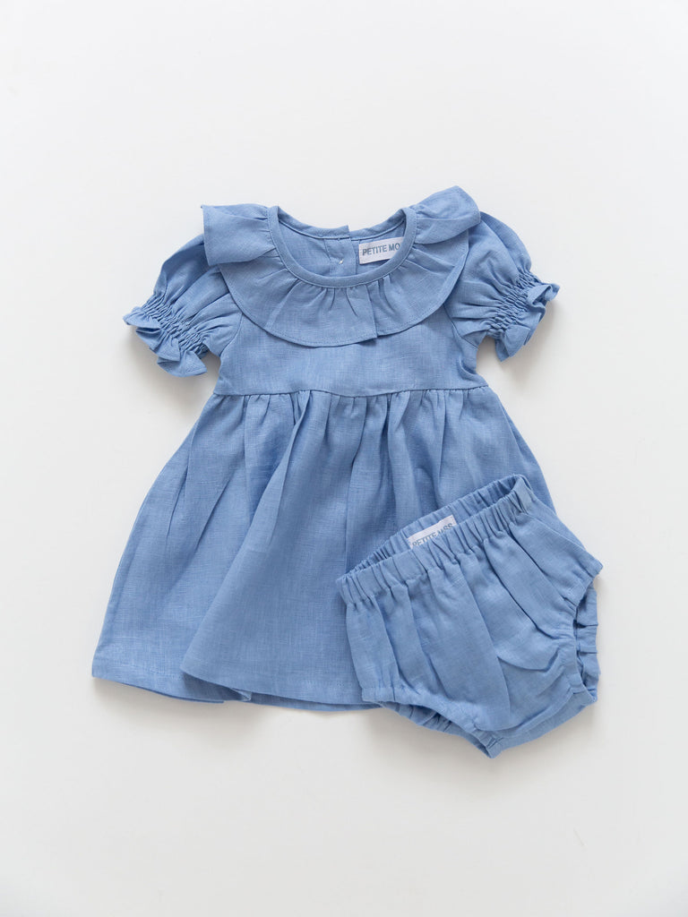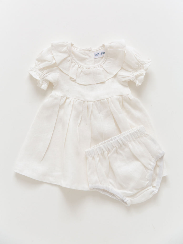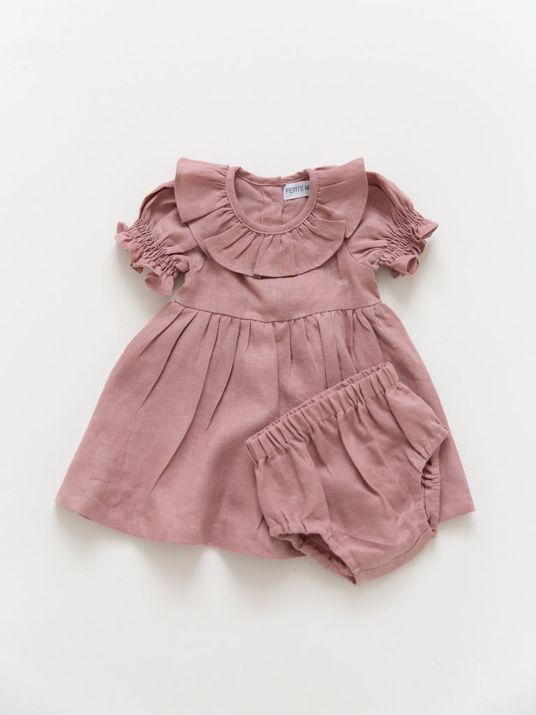 Our Linen Dress with matching diaper cover for infant sizes is a special piece for your baby girl. A delicate frill collar, ruched short bubble sleeves, and a classic A-line cut give sweet feminine details to one of your little girl’s very first dresses. Comes in three classic colors: Rose, French Blue, and White.