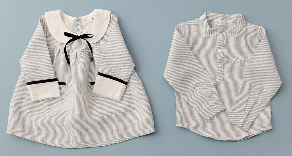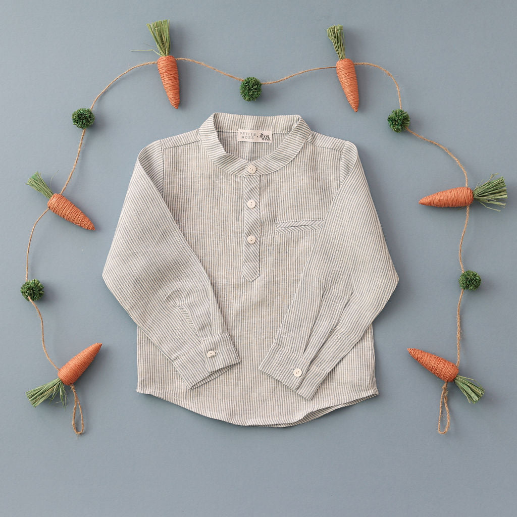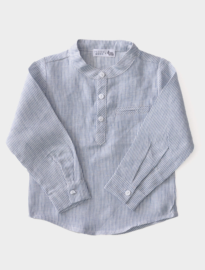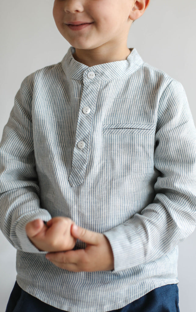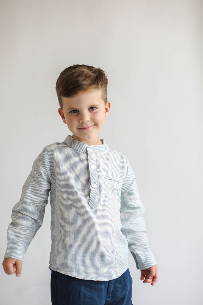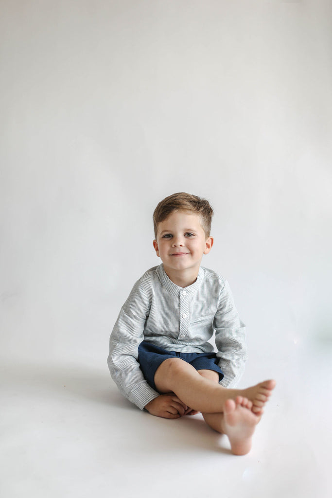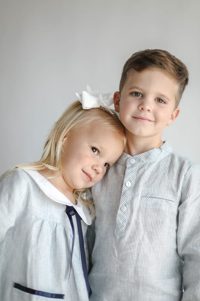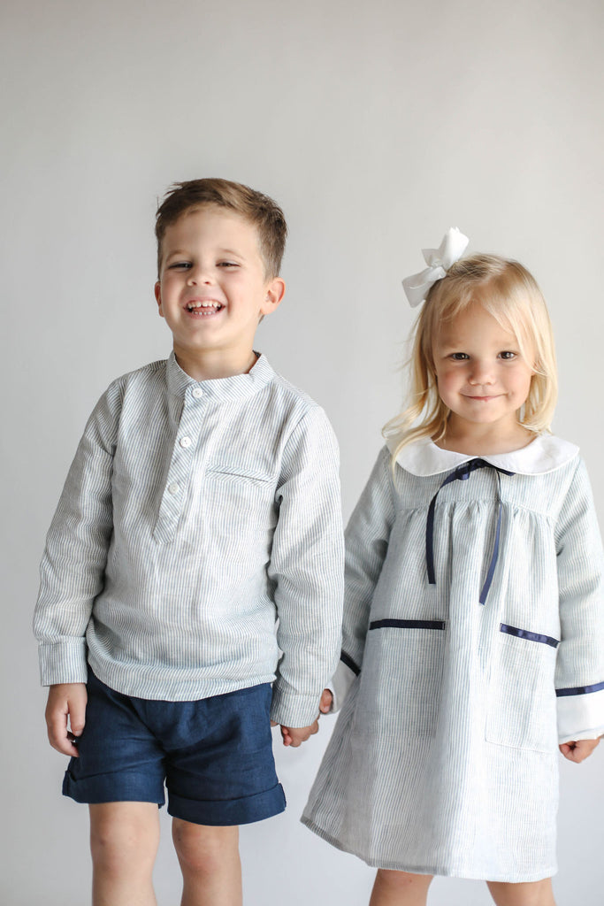 Our Livingston Pinstripe shirt is ready for sunny spring days, made with a lightweight, cotton linen blend and navy pinstripe design. It has long sleeves that can be rolled up for warmer days, a classic grandad collar to stay cool, and a breathable, durable fabric. We love this style paired with the Blaire dress for a sibling matching moment in spring.